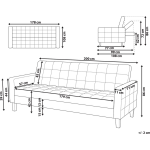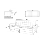 De afmetingen van de bank zijn als volgt: de breedte is 200 cm, de diepte is 77 cm en de hoogte is 86 cm. Het zitoppervlak heeft een afmeting van 179x57 cm en het slaapoppervlak is 179x108 cm. Met een gewicht van 54 kg is de bank gemakkelijk te verplaatsen of in elkaar te zetten. Montage is gedeeltelijk vereist en duurt slechts 20-40 minuten.